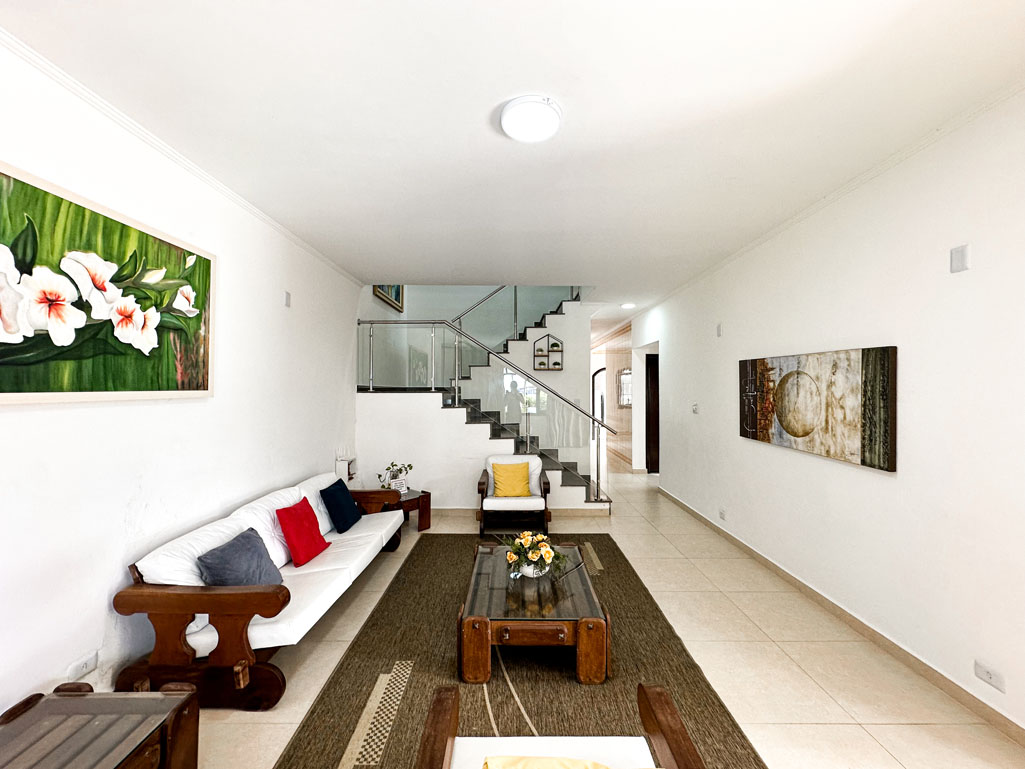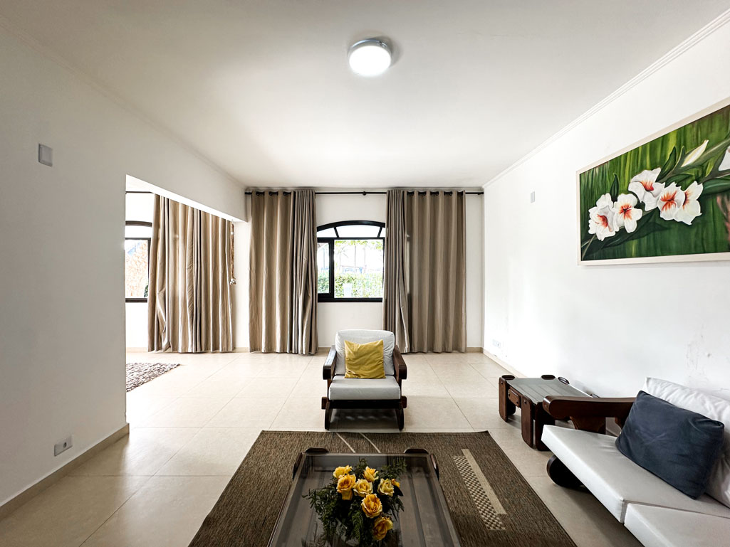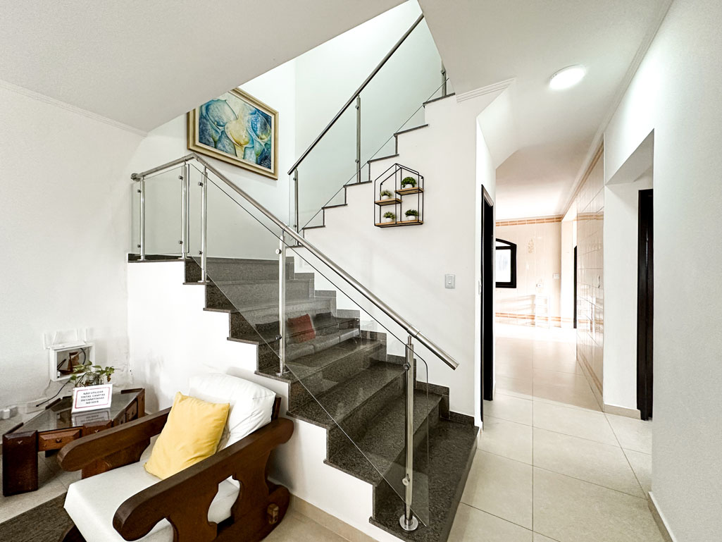 Nos ambientes comuns, como a sala de estar no térreo, a luz natural e a integração dos espaços criam o cenário perfeito para reunir a família e aproveitar bons momentos juntos. No andar superior, a vista para o mar completa a experiência, trazendo ainda mais charme e relaxamento à estadia.